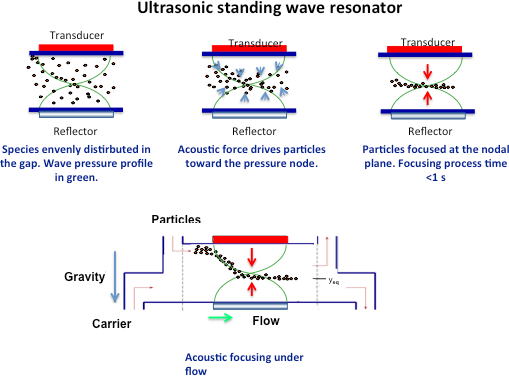 Acoustophoresis consists in using the Acoustic Radiation Force (ARF) created when an ultrasound stationary wave is generated between the two opposite walls of a channel. Depending on the acoustic wavelength (acoustic wavelength equal to twice the channel thickness), it is indeed possible to create an acoustic pressure node at the mid-height of the channel. The ARF drives the particles or cells towards the pressure node where they can then be trapped (“acoustic levitation”) if there is no flow. The typical size of the cells that can be moved by ARF ranges from 100 nm to several tens of microns. The typical thickness of a microchannel can be a few hundreds of microns.