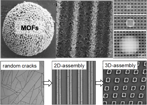 Inspired by the formation of cracks in mud, we demonstrate that cracks can be self-assembled into periodic patterns by controlling the evaporation conditions. Arrays of periodic cracks with several geometries can be obtain without defects over several square cm. In this configuration, cracks diffract lights and can be used as photonic platform for sensing (7). This “bottom-up” method was generalized to a large variety of solution-processed materials (such as oxides) and without any limitation in terms of substrate's shape or dimension. This simple approach enables direct integration of nanomaterials into patterned devices without the limitations of the conventional lithographic techniques.