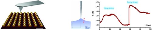 Fig. 1 : Image d'un réseau de nanogouttes de diamètre 400 nm imagé par une pointe AFM représentée schématiquement.