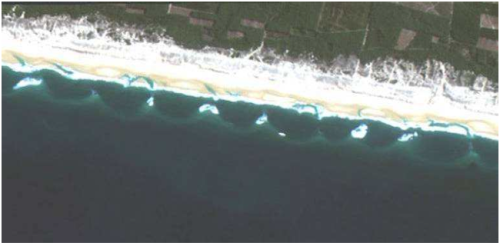 Fig. 1 : Photo satellite prise à marée basse sur la côte Aquitaine représentant les barres subtidales en forme de croissant (λ 750m) et les barres intertidales entrecoupées par des chenaux (λ 350m). @ CNES – KALIDEOS